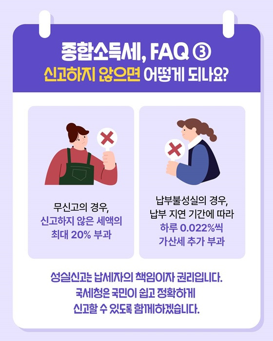 종합소득세는 자진신고 원칙입니다. 기한 내 신고하지 않으면 과태료와 가산세가 부과됩니다.