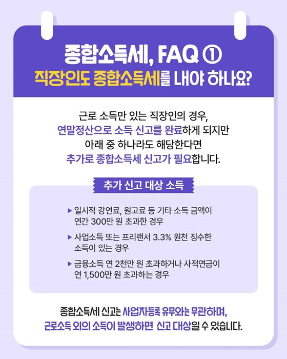 많은 직장인들은 연말정산으로 소득 신고를 마쳤다고 생각하지만, 근로소득 외 추가소득이 있다면 종합소득세 신고가 필요합니다.